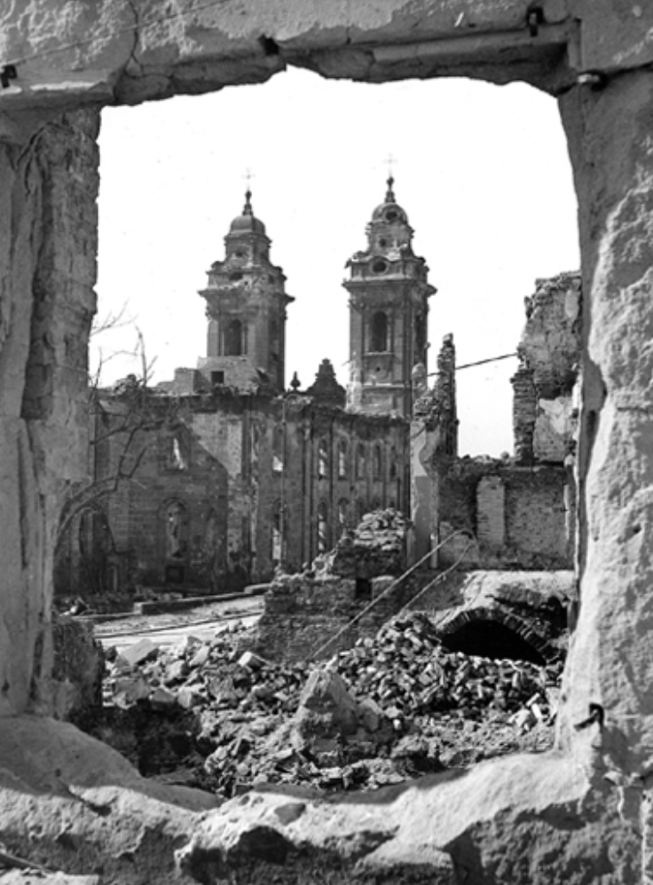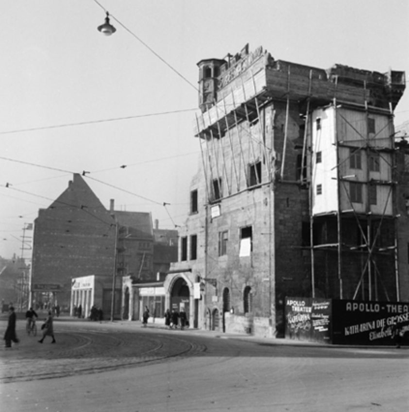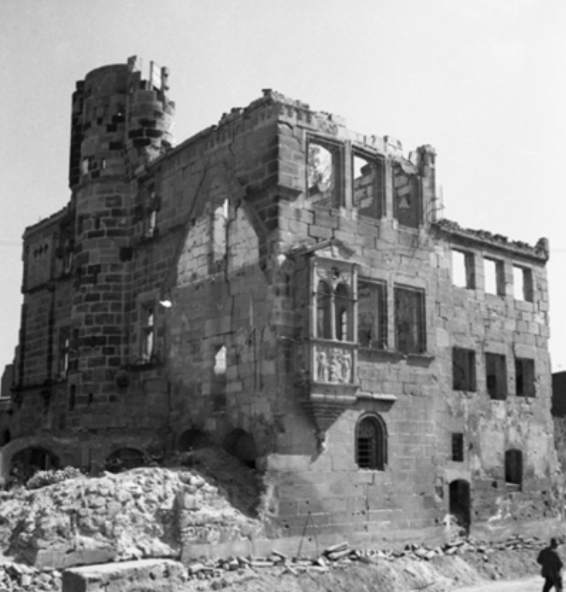 Das Toplerhaus am Paniersplatz vor seiner voll­ständigen Zerstörung, repräsen­tatives Bürger­haus der Patrizier­familie Topler aus dem späten 16. Jahrhundert.