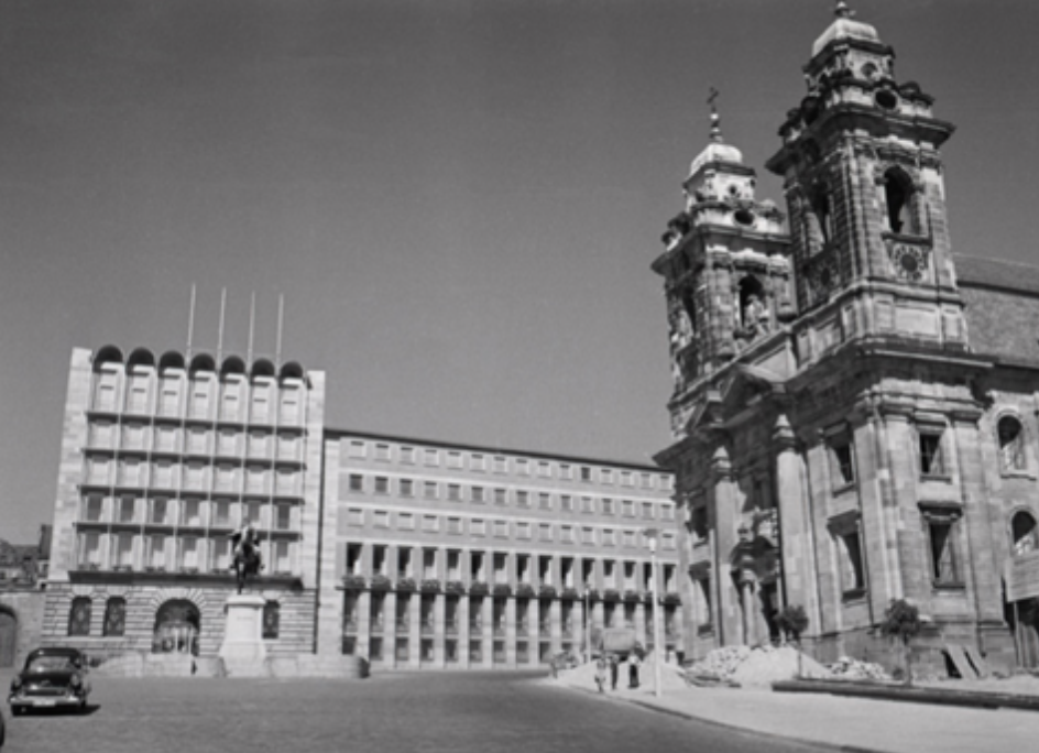 Das Pellerhaus am Egidienplatz, ursprüng­lich ein re­präsen­tatives Wohn- und Geschäfts­haus im Stil der Renaissance, das nach 1945 in einen Neubau überführt wurde.