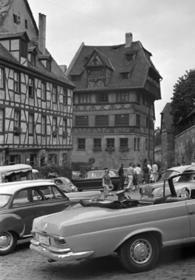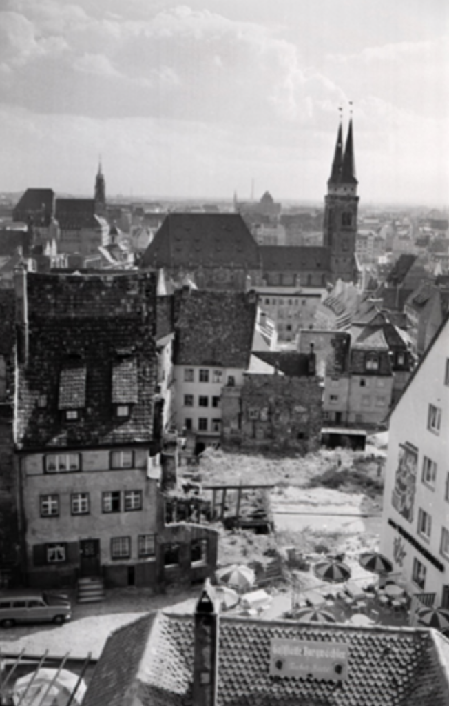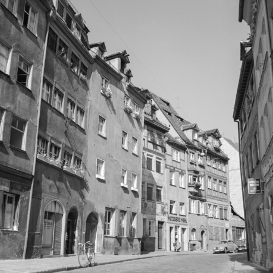 Die Weißgerbergasse, Hand­werker­viertel der Nürnberger Weißgerber vor der Freilegung der mittel­alterlichen Fachwerk­fassaden.