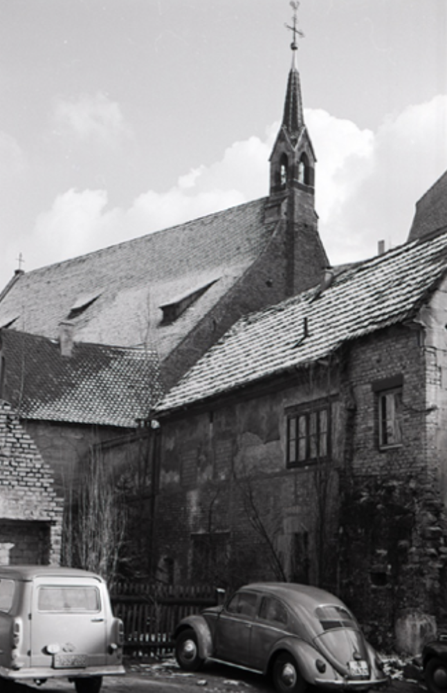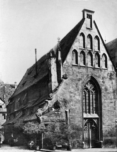 Die Moritzkapelle am Schürstab­haus vor ihrer Zerstörung, kleine spät­mittel­alterliche Stadt­kirche mit populärer Gaststätte "Bratwurstglöcklein".