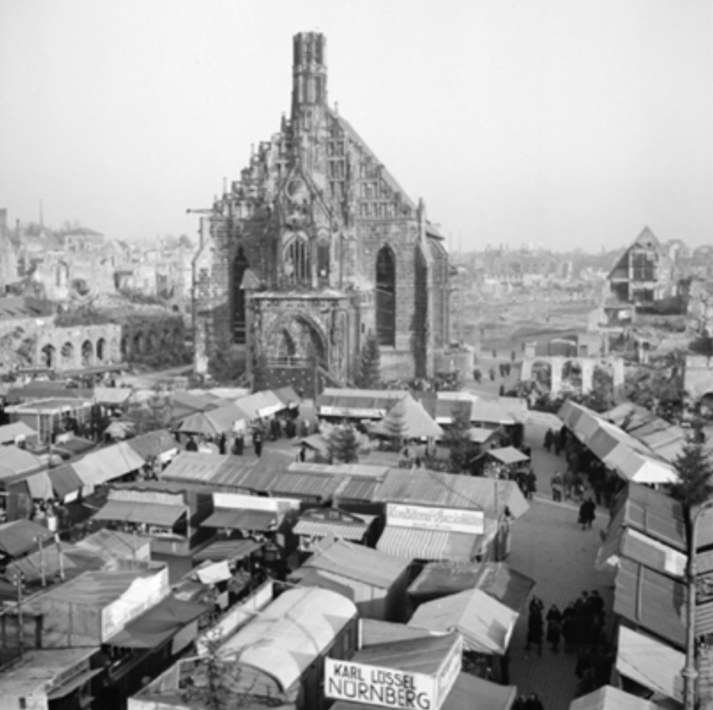 Der Hauptmarkt, seit der Verbindung der Lorenzer und der Sebalder Stadt­hälfte im Spät­mittelalter das Zentrum der Altstadt und Marktplatz im ehemaligen jüdischen Viertel.