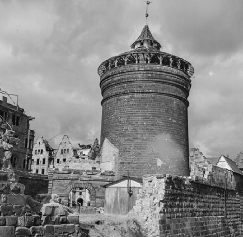 Die Fronveste mit Schlayerturm, Fluss­überbrückung der letzten Stadt­befestigung am Pegnitz­ausfluss, die als Waffen­lager und Gefängnis genutzt wurde.