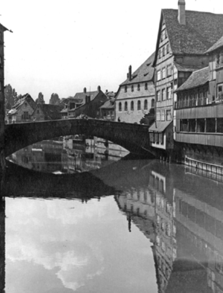 Das Henkerhaus mit Henkersteg am Trödelmarkt. Ensemble der vorletzten Stadt­befestigung aus dem 13. Jahrhundert und späterer Wohnort des Nürnberger Henkers.