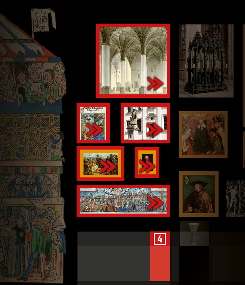 Allegory of the Reformation in Nuremberg, unknown artist, 1559, coloured giant woodcut of 5 blocks, Museen der Stadt Nürnberg, Kunstsammlungen, Inv. No. Gr.A. 12632.